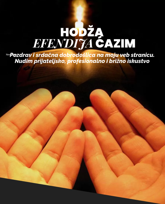 Ukoliko se osjećate teško, i vidite da sve oko vas ide teže, da se stalno pojavljuju prepreke – javite se, Hodža Efendija Ćazim će za Vas skinuti crnu magiju, skinuti uroke i nagaze, ukloniti sihire zapisima,otkriti ureknuta i ukleta mjesta, izraditi posvećene amajlije za Vašu zaštitu, pomoći u bolestima zavisnosti i alkoholizma, vratiti voljenu osobu, ukloniti negativnu energiju,zaštiti Vaš dom i obitelj.